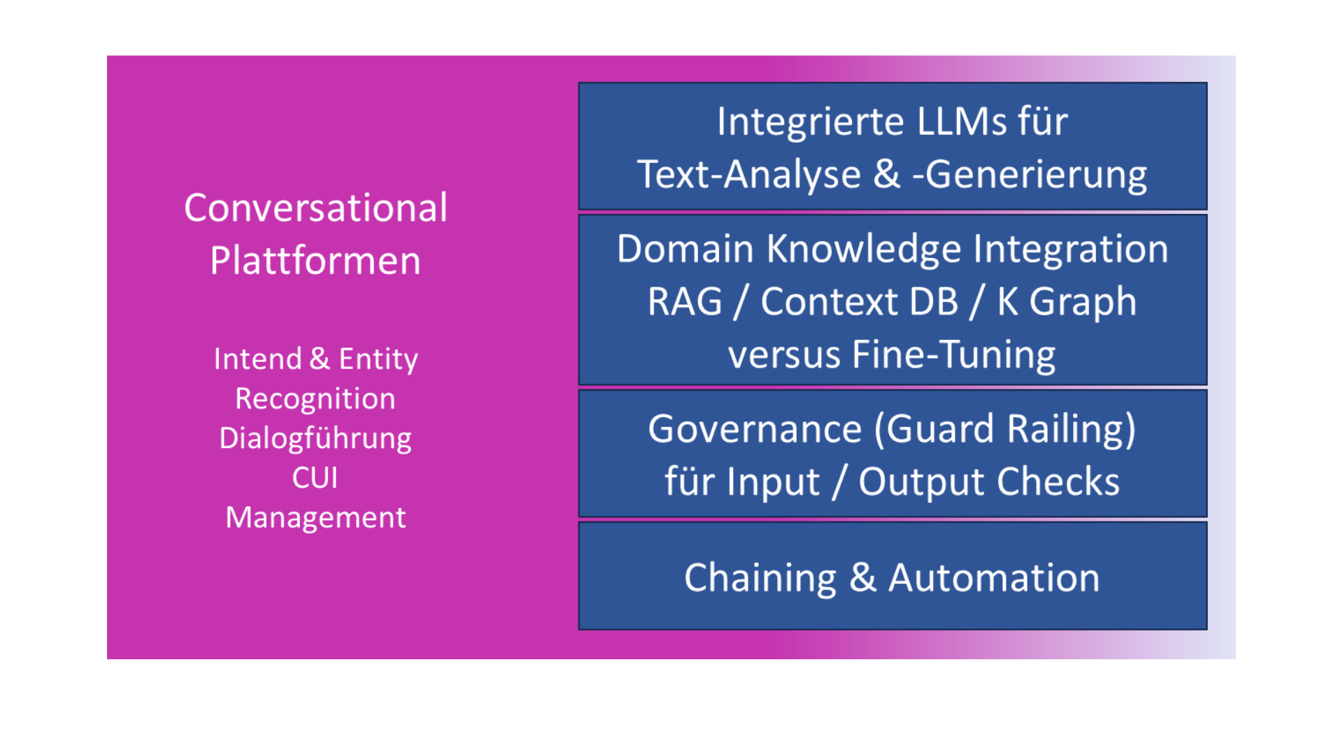 Ergänzend zu dieser eher kontrollierten Gesprächsführung soll die Integration von Large Language Models (LLMs) erweiterte Möglichkeiten bringen. Neue Funktionen, wie die Nutzung von LLMs für die Textanalyse und -generierung, ermöglichen tiefere und kontextuellere Interaktionen. Zudem kommt die Integration von Domänenwissen durch Technologien wie Retrieval-Augmented Generation (RAG), Kontextdatenbanken oder Knowledge Graphs hinzu. Diese Ansätze konkurrieren mit dem Fine-Tuning der Modelle und bieten eine flexible Möglichkeit, spezifisches Fachwissen in die Konversationssteuerung einzubinden.